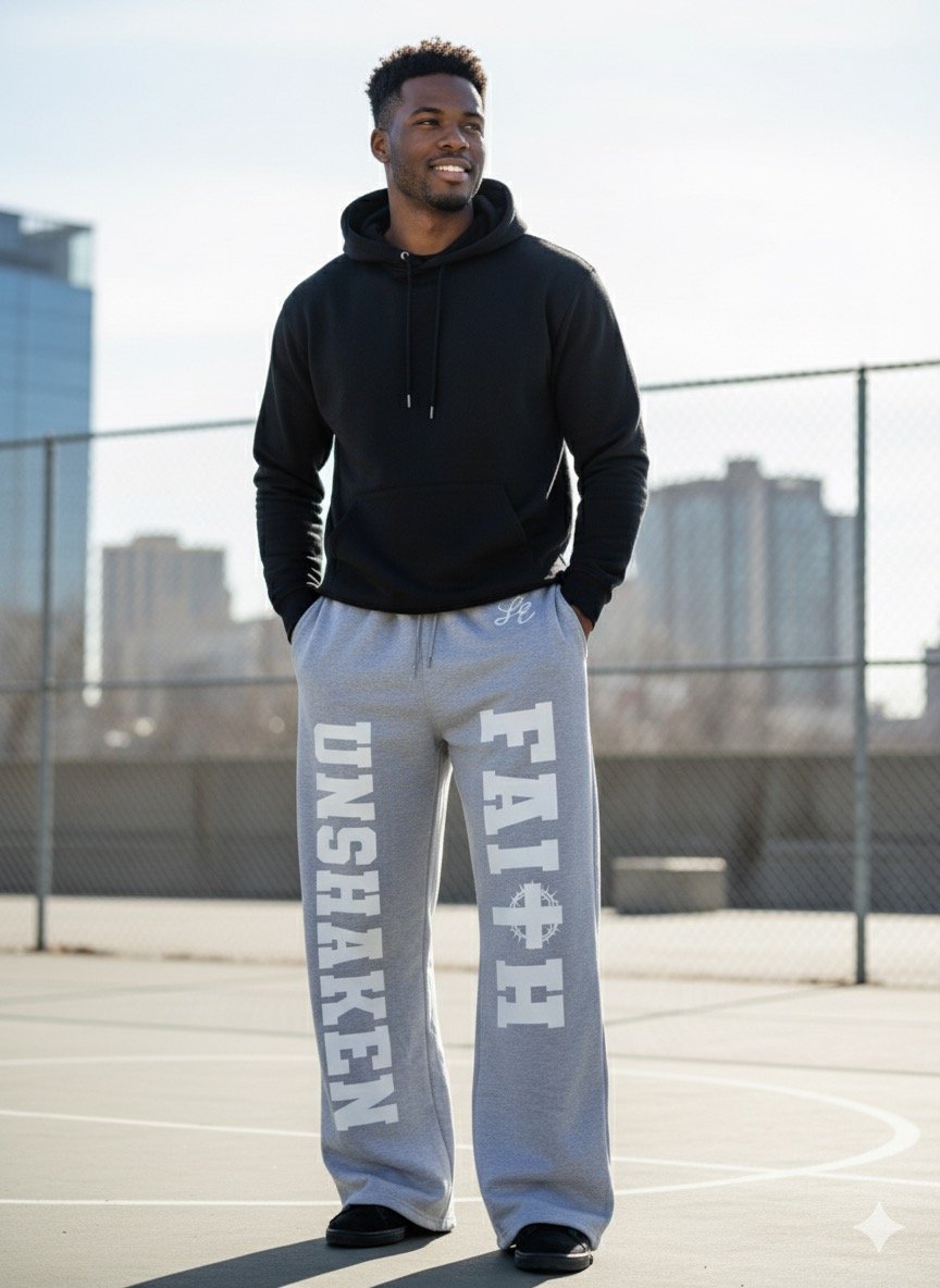 Key Details: Gray, heavyweight, plaid waistband, FAITH + UNSHAKEN down both legs, LE embroidery